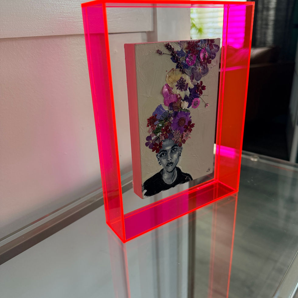 Pretty Petals is a joyful fusion of portraiture and pressed florals, where bloom and being become one. Anchored by a monochrome face painted in oil, the piece bursts upward into a crown of real dried flowers—an expressive flourish of color, texture, and life. Encased in a vivid neon pink acrylic frame, this small but striking work speaks to imagination, growth, and the beauty of what blooms when we let our minds wander freely. A celebration of inner worlds and natural wonder, Pretty Petals invites the viewer to see thought as a living, blooming thing.